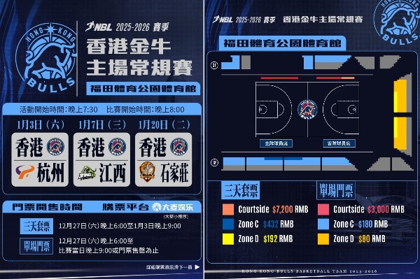金牛今次推出「三天套票」,讓球迷以優惠價格一次過欣賞3場主場焦點賽事。三天套票票價為Courtside的7,200元人民幣(下同)、Zone C的432元及Zone D的192元。另外,賽事亦設單場門票,價錢分別為Courtside的3000元、Zone C的180元及Zone D的80元。所有門票將於今晚6時起於大麥小程序正式開售,數量有限,售完即止。